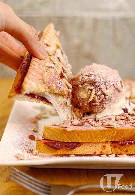 紫薯多士大戰阿珠媽年糕和雪糕 $63 薄片方包內夾着紫薯蓉和手製煙韌年糕,烘香表面脆卜卜,中心亦帶拉絲的半融狀,口感豐厚,吃得好滿足!