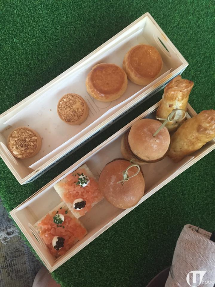 部分鹹甜點會放在小木盒內,包括手撕豬肉香腸卷、迷你蟹肉漢堡、魚子醬伴煙三文魚軟包、迷你吉士撻等。