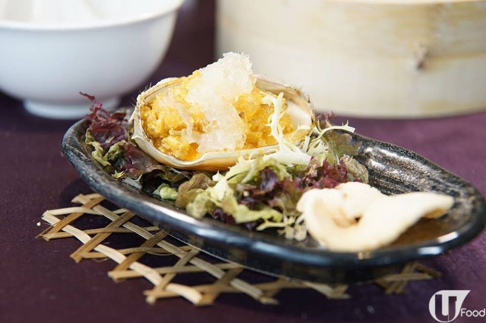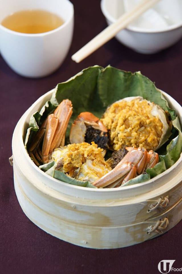 籠仔荷香蟹粉糯米蒸大閘蟹,大廚將糯米用酒糟爆香,再混入蟹粉、蟹肉、蟹油、花雕、薑米撈勻蒸 45 分鐘,再將蟹粉糯米飯釀入蟹蓋,以荷葉包好蒸 10 分鐘,工夫多多,每啖都係心機。