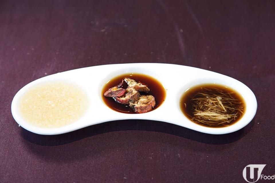 大廚還在蟹醋中花心思,子薑酒糟蟹醋(右) 用當造子薑加入米醋中,再加檸檬、去皮子薑、酒糟、砂糖及少量紅椒浸 3 個月,味道清香。山楂荔枝蟹醋(中)將山楂、荔枝醋及冰糖同浸,微酸帶甜又開胃。而秘製大閘蟹醋(右)是師傅自行調配加入薑絲的鎮江浙醋。