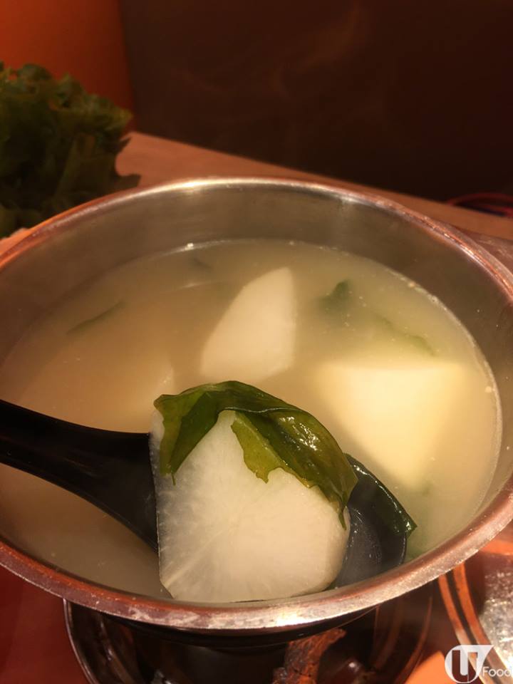 鍋物配料有粟米、冬菇、金菇菜、粟米及津白,在味噌湯內灼,湯頭都有蔬菜的鮮甜。