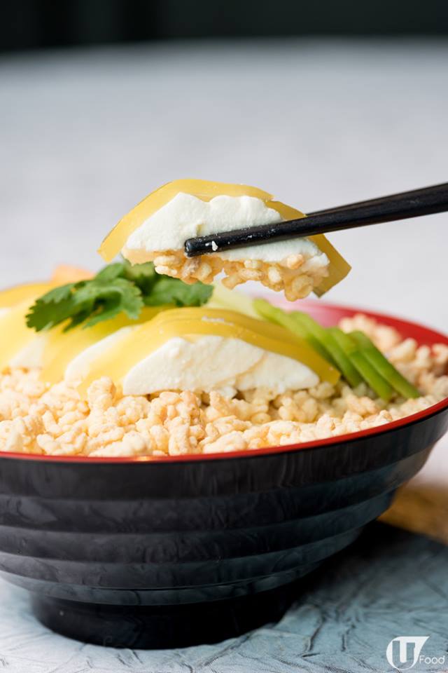 「海南雞」係菠蘿果蓉啫喱 + 椰子慕絲,「飯底」則係呍呢嗱味海綿蛋糕,配上鮮菠蘿果蓉啫喱、椰子慕絲及金不換吉士慕絲,飯粒則是卜卜米。