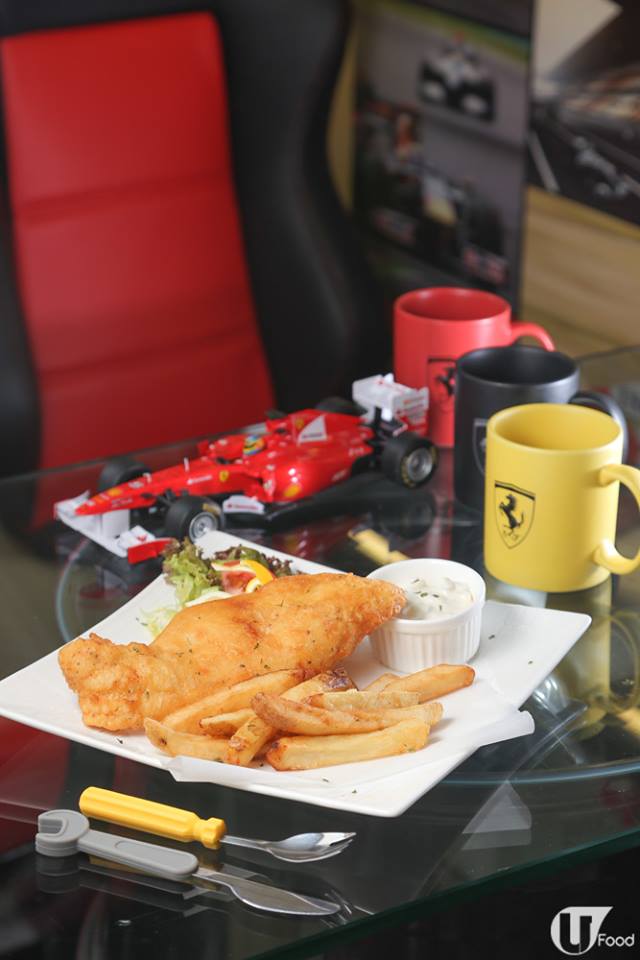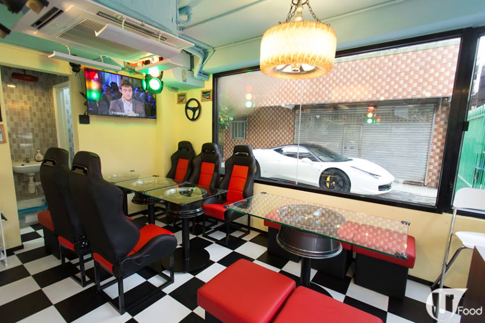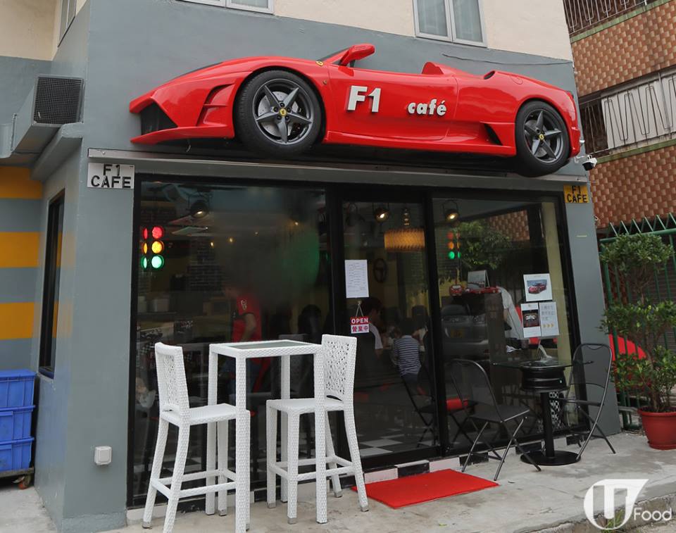 比鄧達智間 cafe 更搶眼的,有呢間門口頂住架紅色跑車的 cafe,原來老闆是鄧達智的堂弟,而且係一個超級跑車迷。一進店,就可以感受到他對跑車的熱情 ── 賽車紅綠燈、紅黑賽車座椅、黑白賽旗地板,還有用真呔鈴打造的玻璃枱,以及收藏多年的法拉利模型車、拼圖,侍應都穿上賽車 Tee,鋪天蓋地都是跑車賽車,成間舖都係影相位!
