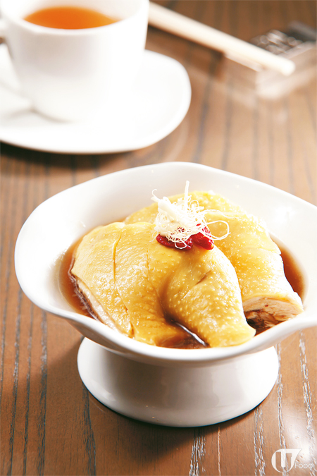 分量足有四份一隻,本地雞以韓國人參、花雕及清雞湯慢火浸煮 45 分鐘再浸冰水,食落帶淡淡酒香,雞皮爽雞肉嫩。