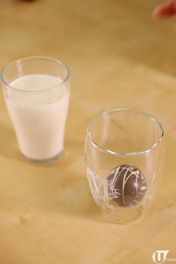 朱古力亦唔係粉裝沖劑咁求其,係一個朱古力球,以扭蛋載住,好驚喜!朱古力球用黑朱古力製,上面有白朱古力花紋,好似聖誕樹上嘅波波!黑朱古力中滲透住白朱古力,潛台詞係朱古力奶沖出嚟唔係一味甘苦。
