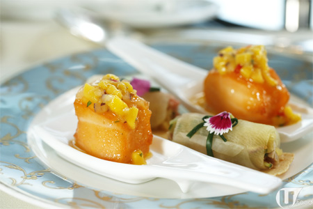 烤鱈魚伴香芒醬(左) 係餐廳 signature 點心,將魚身烤香,伴襯芒果甜味,好醒胃。烤鴨子姜日本大根卷伴海鮮醬,清、甜、酸、爽,有北京烤鴨影子。