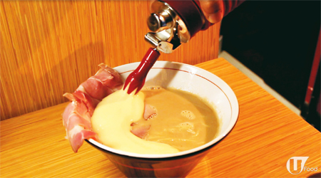 將黑松露醬與橄欖油拌勻打成泡沫,唧在拉麵上,再刨上黑松露片,未吃已嗅到濃濃的松露香,非常誘人,味道與濃厚的鹽豬骨湯非常夾。