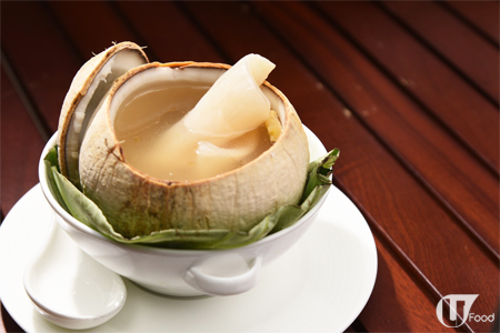 用泰國椰皇及巴西鹹水黃花魚花膠,加上椰子水及雞湯燉足 2 個鐘,味道清鮮清甜,好滋潤啊。
