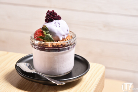 紫薯粉也不要錯過這奶凍,底層?奶凍呈淡淡紫色,原來甜品師先於牛奶內加紫薯煮好,再過篩避免紫薯粉沉澱影響賣相,最後加忌廉,令奶凍更滑溜。紫薯奶凍上唧有一層紫薯蓉、脆脆及芋頭味雪糕,一杯甜品食盡香滑及脆脆嘅口感。